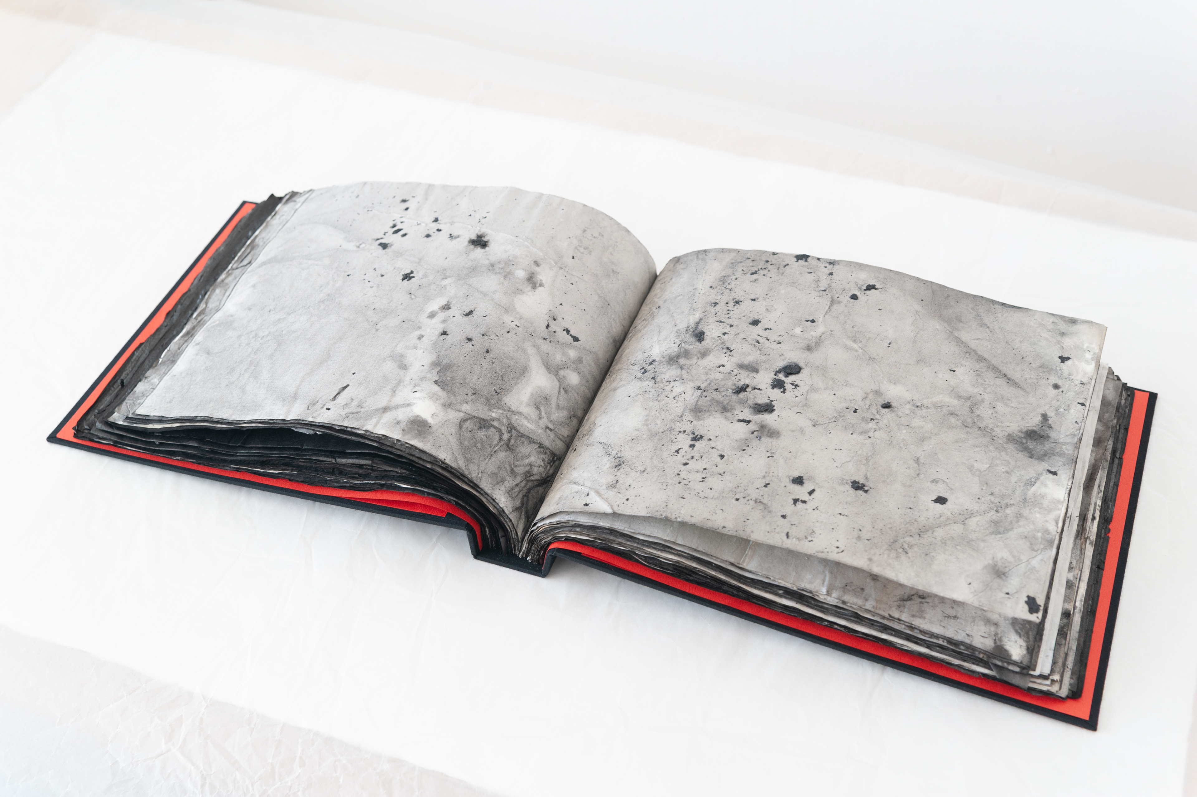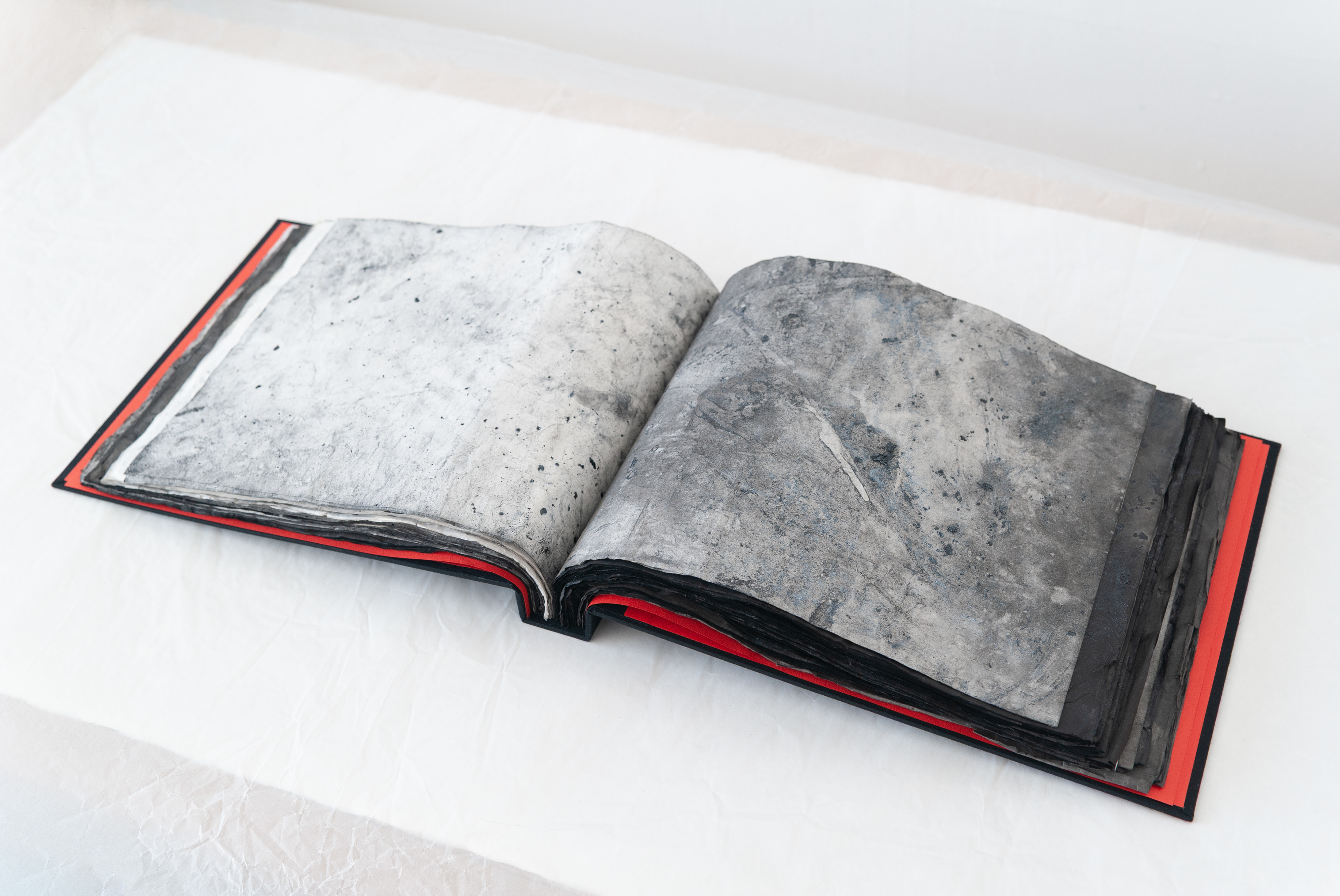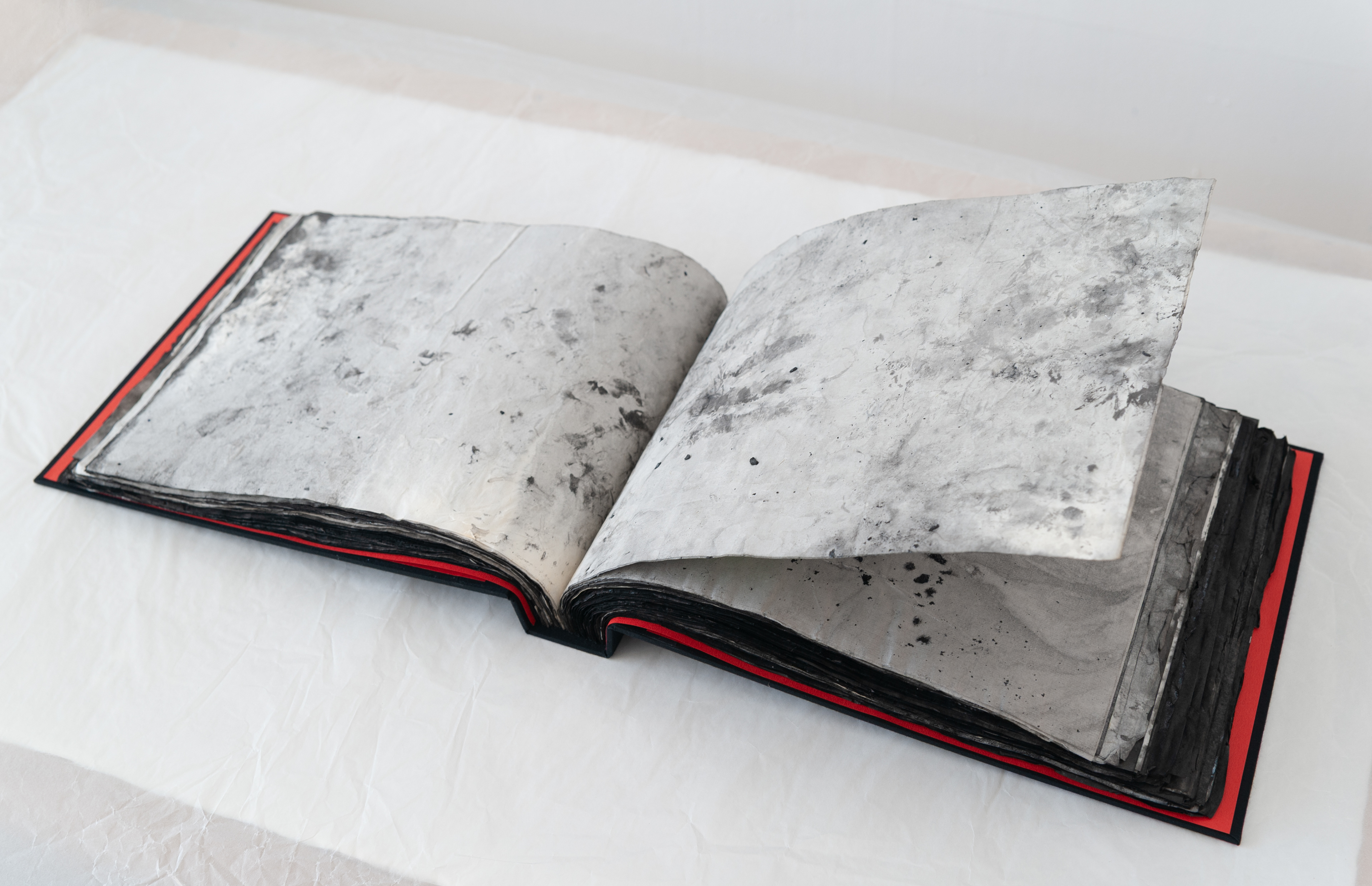 2023, artist's book (monotype with silver and black sumi ink, gofun pigment, mixed media on washi),