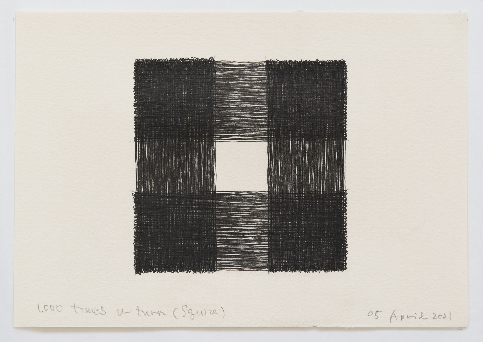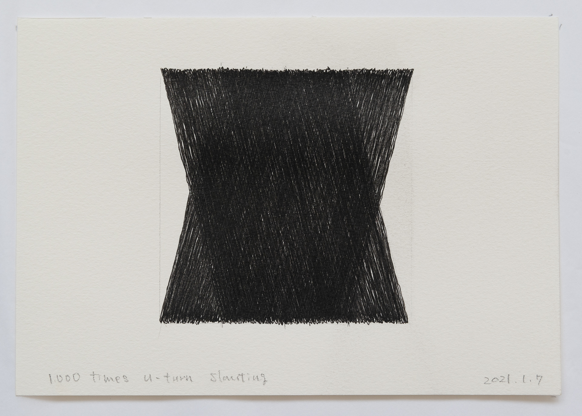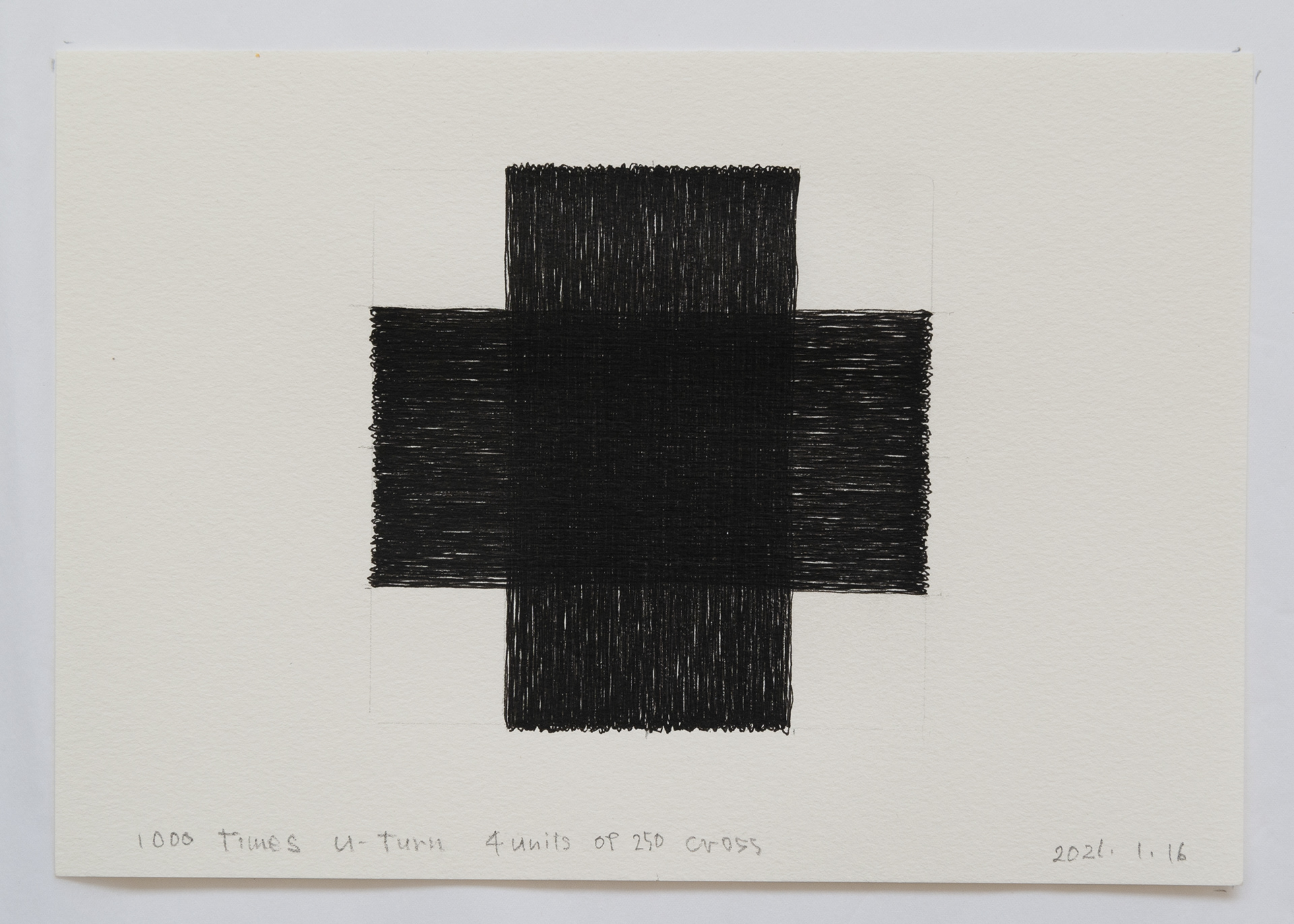 For my 1000 Times U-turn Drawing (part of my Drawing Series), I created different shapes and designs using a single unbroken line based on a diagram. While drawing the line, I imagine that I am binding string around a metal plate. Sometimes I use drawings when I make a plate, and sometimes not. The action of drawing is more important than the result and inspires my imagination.